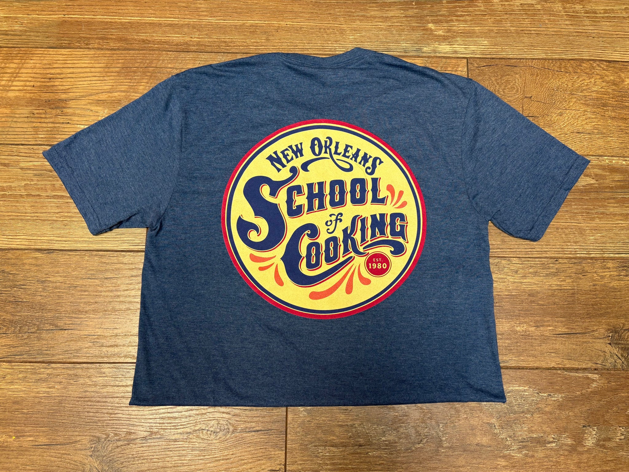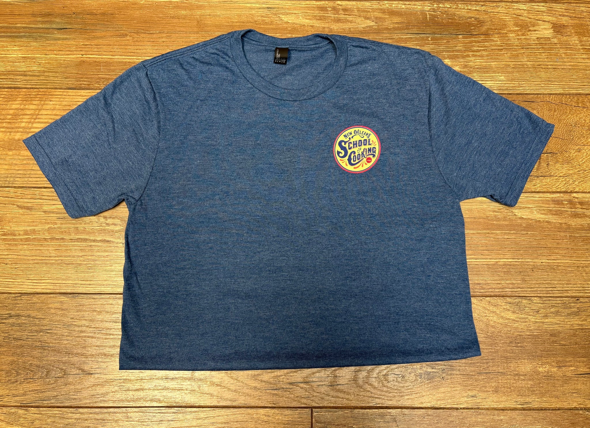 Show off your flavor for tradition with this heather blue tee, featuring our vintage New Orleans School of Cooking logo. Soft, lightweight, and full of flair, it’s the perfect blend of comfort and character—just like your favorite Creole dish. Whether you're stirring up a roux or strolling the French Quarter, this shirt lets everyone know; you cook with soul.