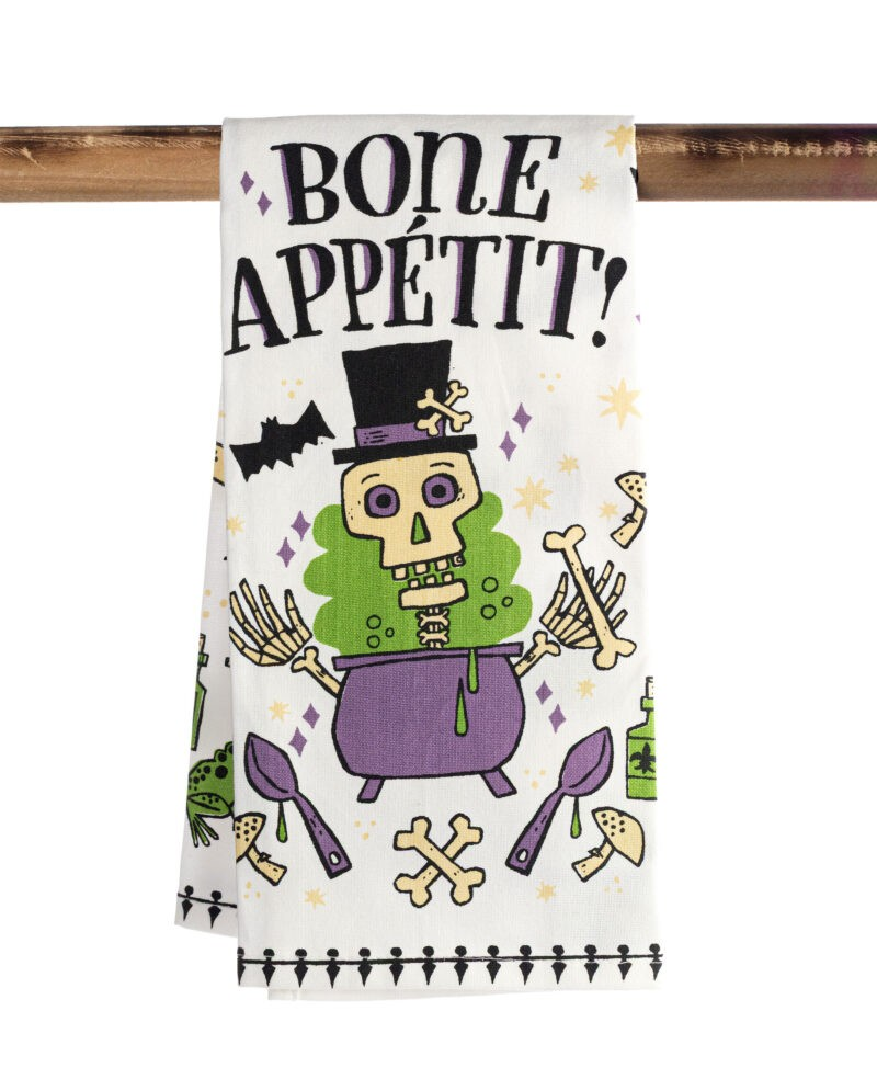 Serve up scares and style this Halloween with this festive “Bone Appétit” kitchen towel! Featuring a playful skeleton design and a clever foodie pun, this towel is perfect for spooky season entertaining or gifting. Both frightfully fun and functional, it’s a bone-afide kitchen essential!