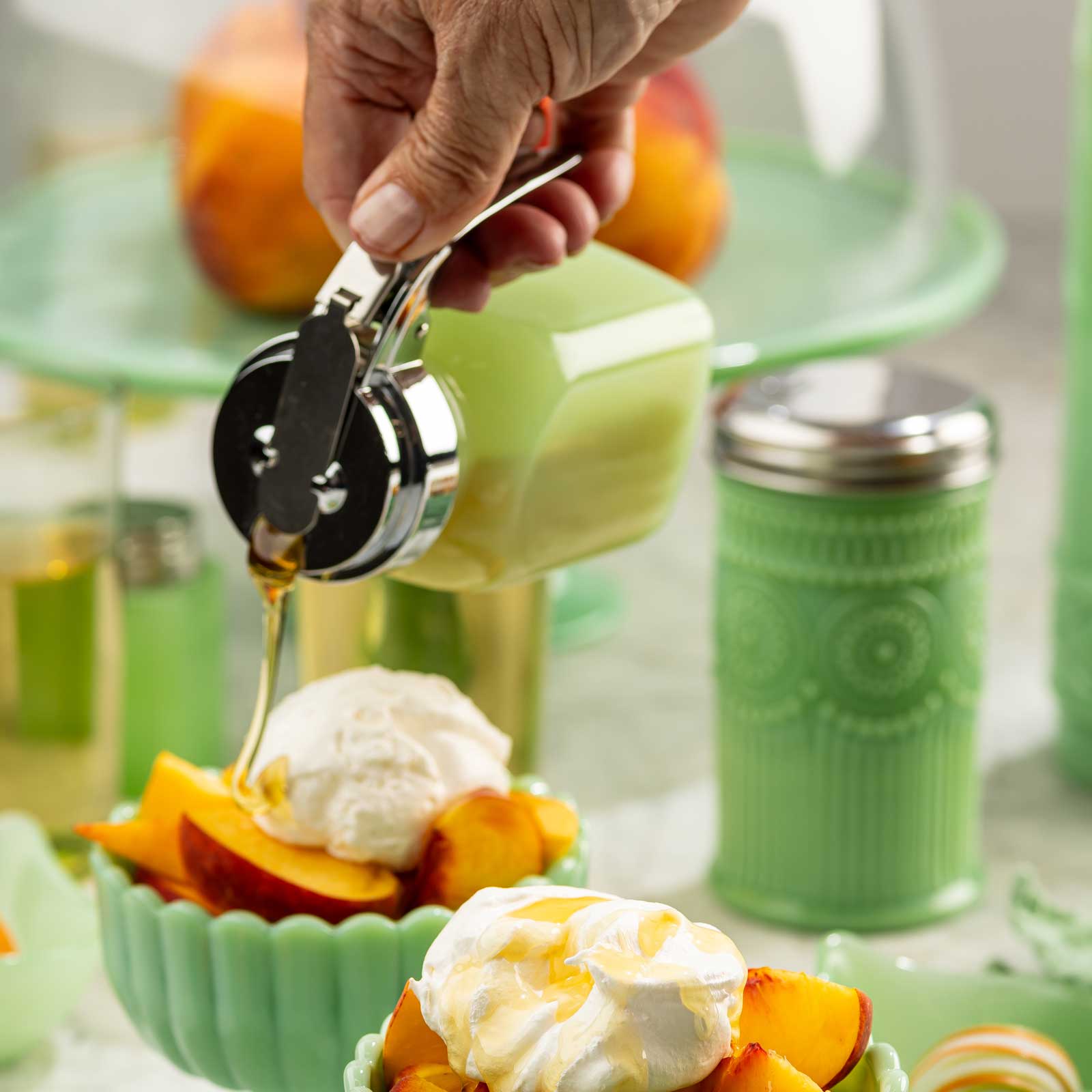 The Jadeite glass syrup dispenser is perfect for passing syrup around the table. This reproduction piece is designed after the original opaque-milk green glass and features all the traditional charm of the authentic pieces to add a touch of yesteryear to your tabletop.